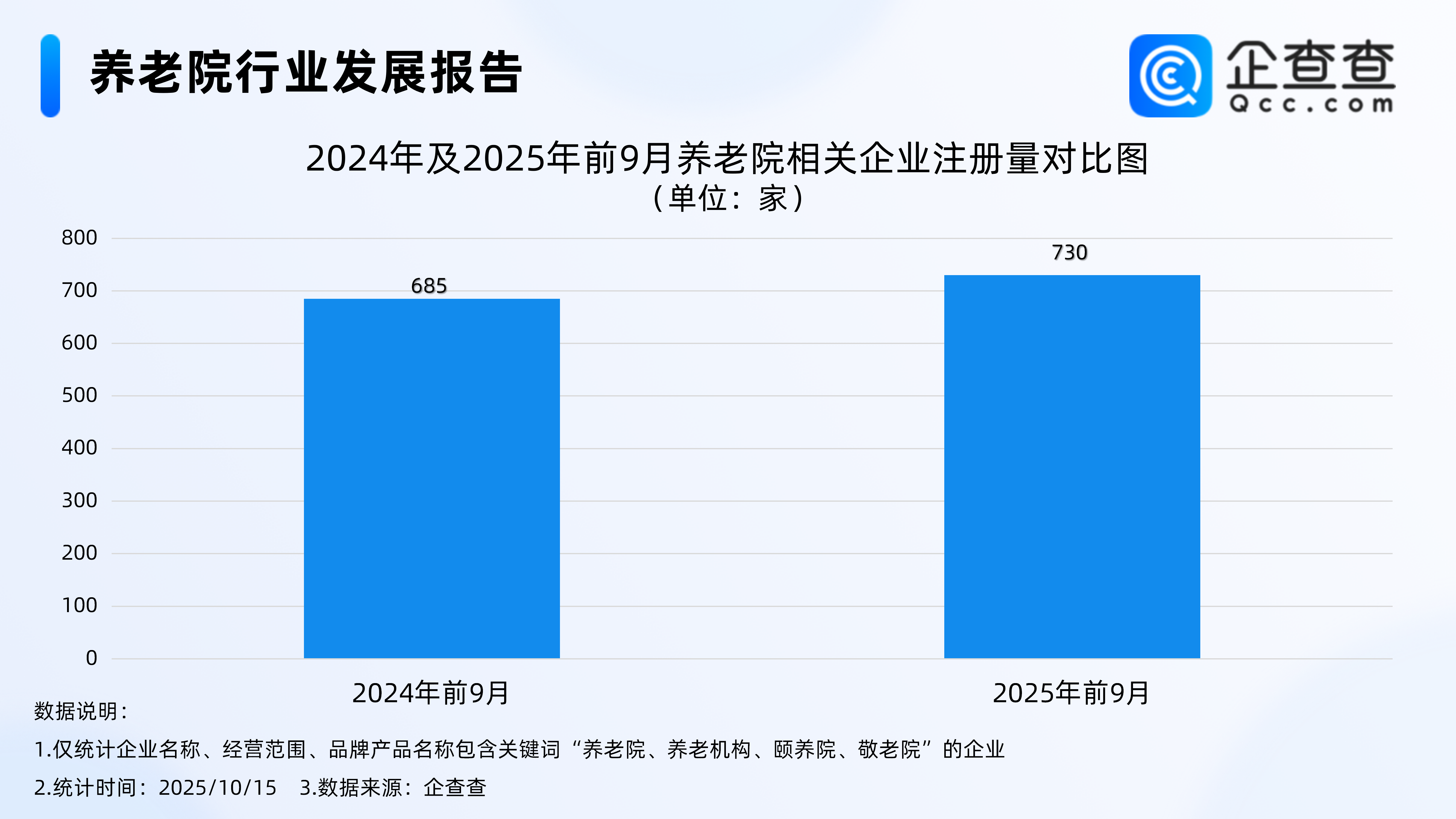 近日,浙江一位21岁女生以每月1500元的租金入住养老院陪护奶奶的新闻引发关注和讨论,而更值得关注的是,报道中院方提及“还有两名女生已交钱准备入住”。对于当下年轻人来说,“拎包入住”的养老院可为生活提供标准化、专业化服务,免去打理诸多繁杂的家务,折射出年轻人对从容生活向往的同时,也反映了目前养老院的设施完善及管理规范。企查查数据显示,截至10月15日,国内现存养老院相关企业2.94万家。注册量方面,2024年全年注册养老院相关企业915家,截至目前,今年已注册744家,其中前9月注册730家,同比增长6.57%。存量方面,从经营时间来看,养老院相关企业多为老牌企业,超七成相关企业成立5年以上,其中成立年限在5-10年的相关企业最多,占比51.55%。从地区分布来看,养老院相关企业主要集中分布在华东地区,占比达30.61%。1.今年前9月相关企业注册量同比增长6.57%