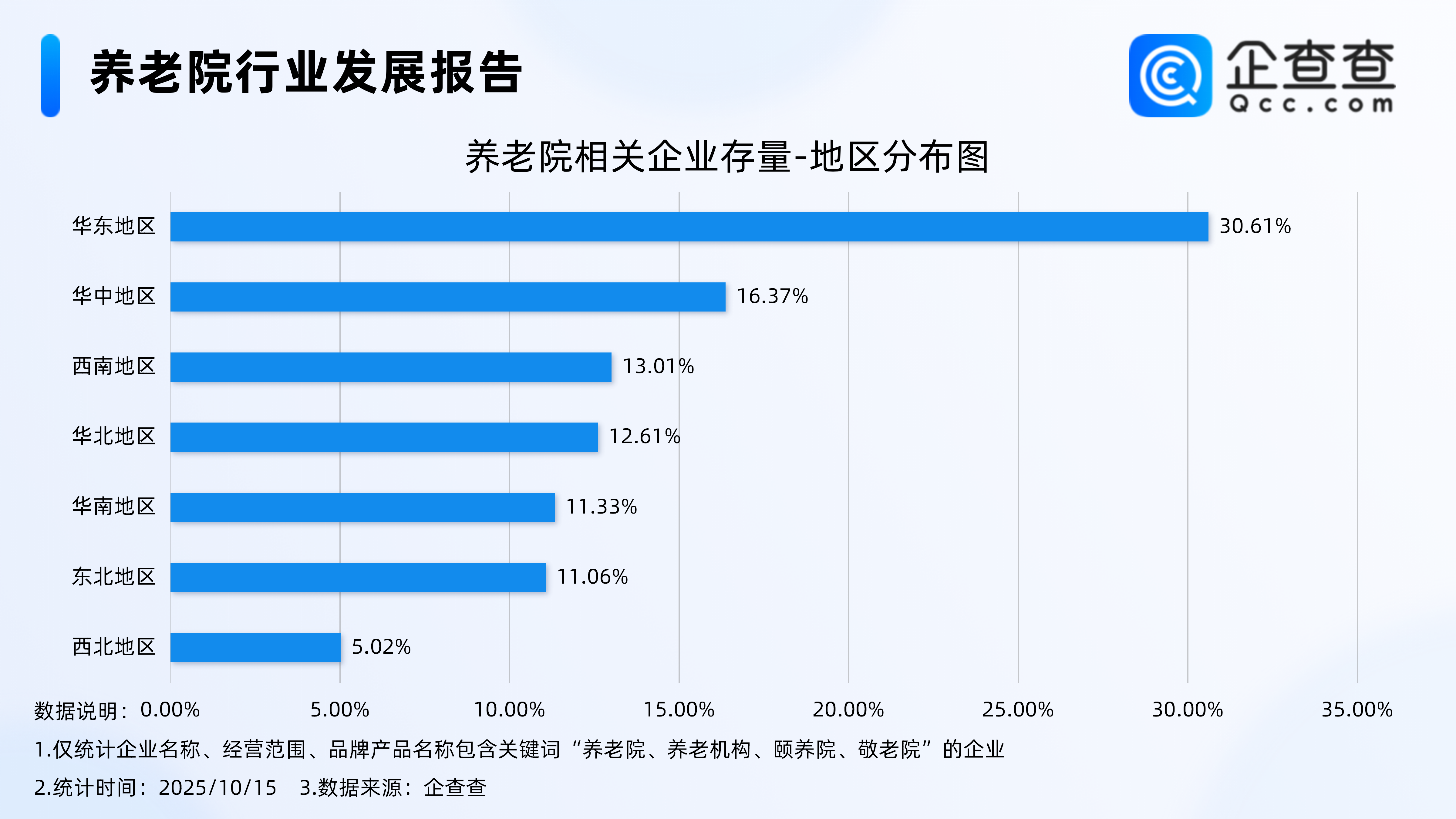 企查查数据显示,从经营时间来看,养老院相关现存企业多为老牌企业,超七成相关企业成立5年以上,其中成立年限在5-10年的相关企业最多,占比51.55%。成立年限在10年以上的相关企业占比23.95%。3.相关企业主要集中分布在华东地区